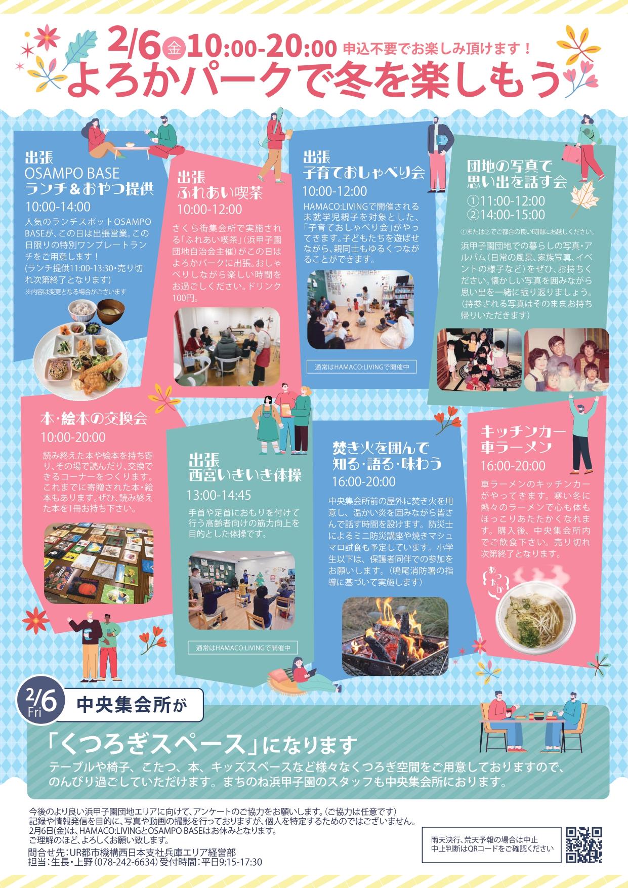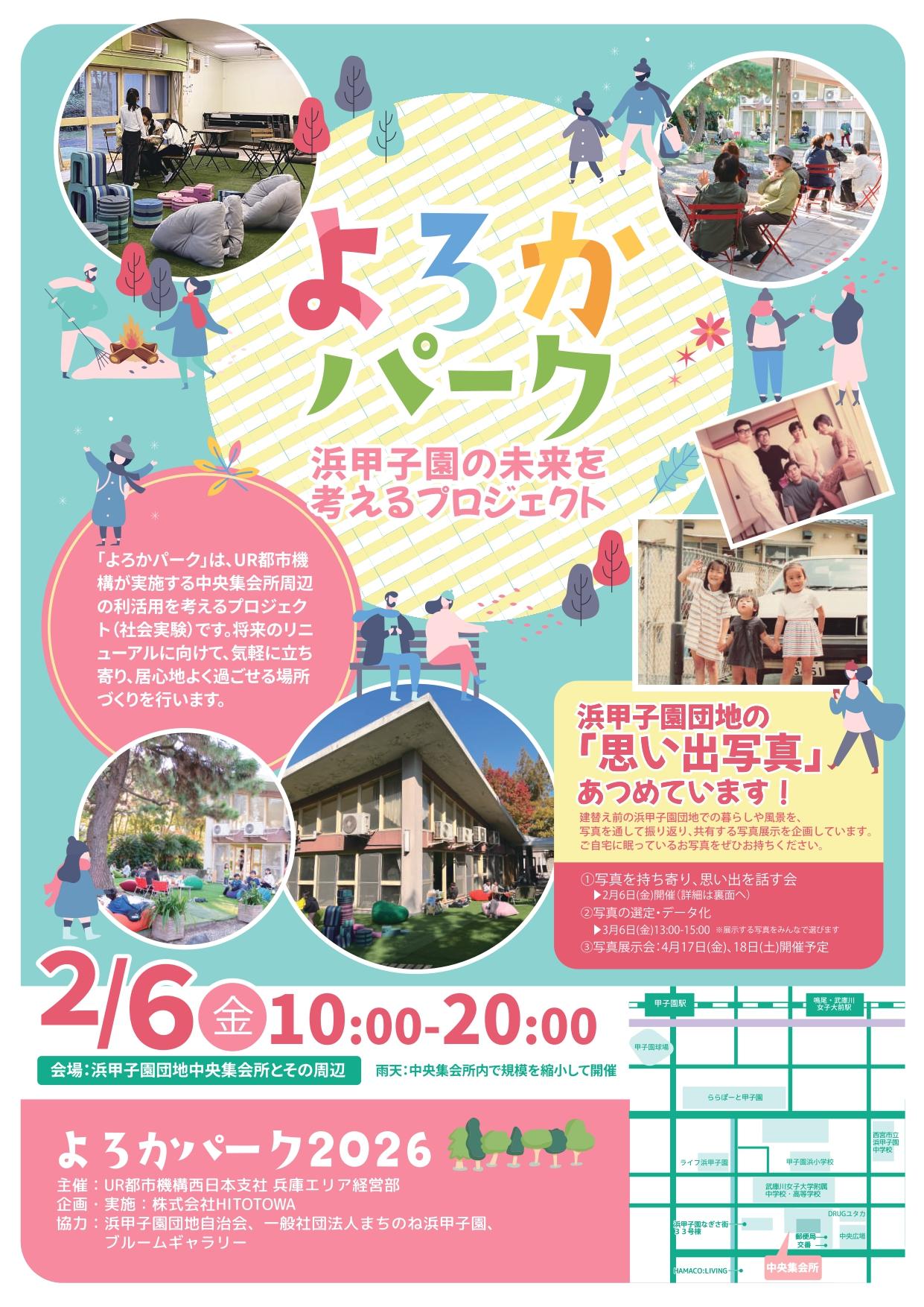 「よろかパーク」は、UR都市機構が実施する浜甲子園団地中央集会所周辺の利活用を考えるプロジェクト(社会実験)です。浜甲子園エリアの価値向上を目指し、中央集会所とその周辺をフィールドに、エリアの活用や運営方法の検討を目的に実施致します。立ち寄りたくなる、居心地の良い空間でお待ちしております。